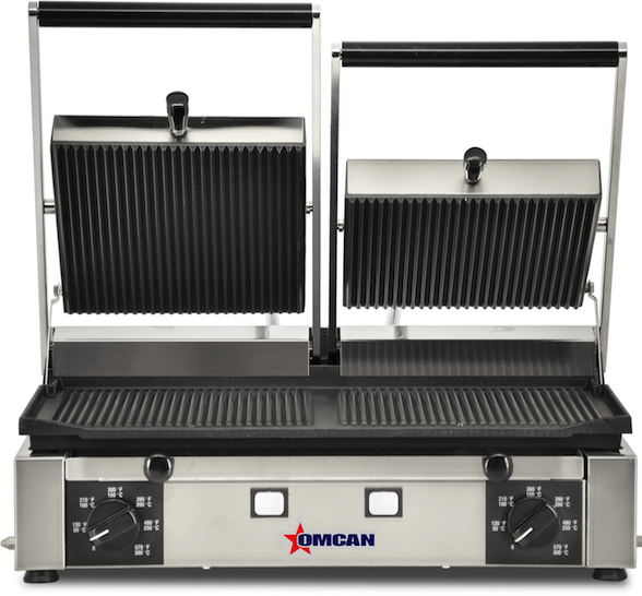 This Omcan grill is ideal for quesadillas, panini, focaccia, and pita sandwiches. This model has a stainless steel body with a cast iron grilling surface for easy cleaning.
