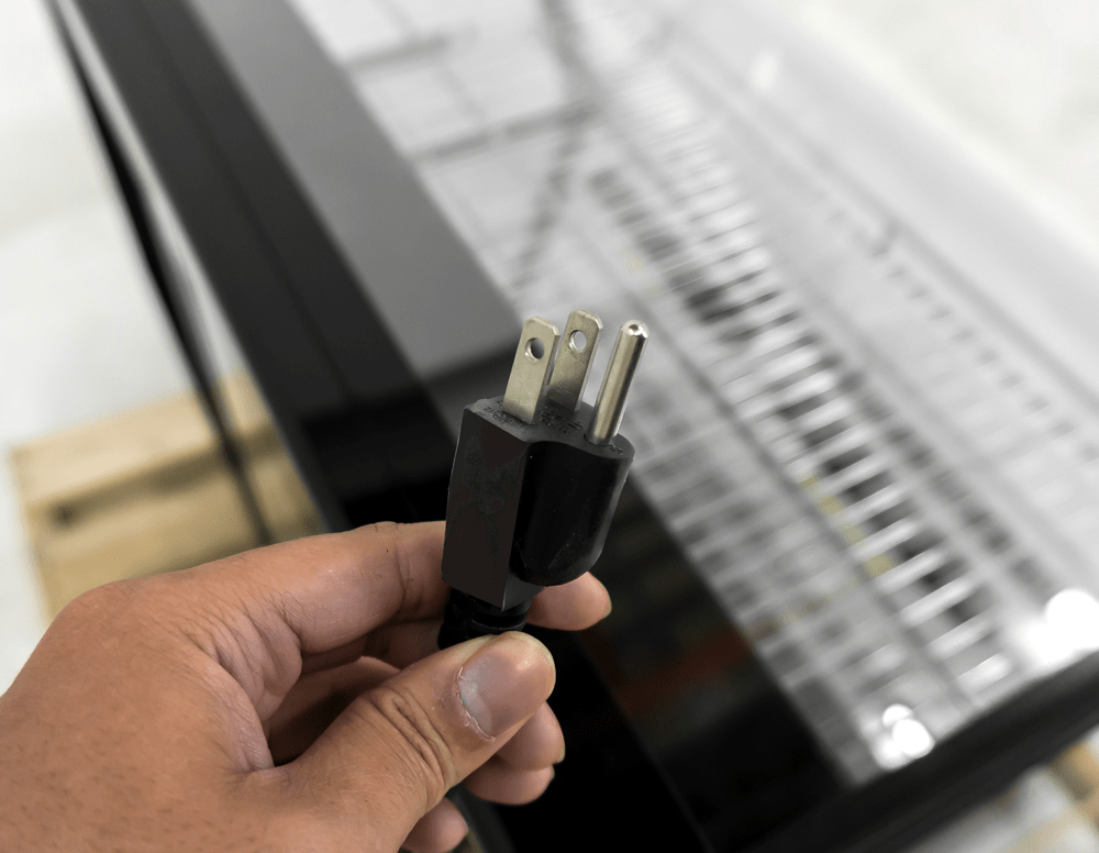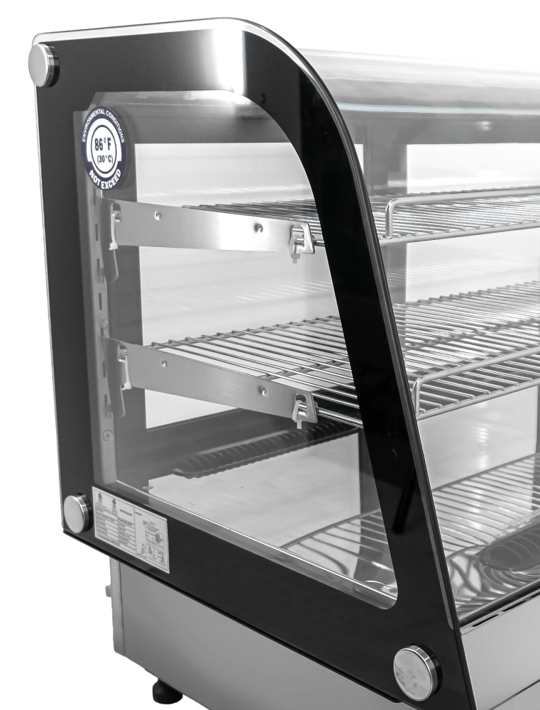 The showcase has a tempered glass display, curved at the front and sliding doors at the back. There is a digital thermostat for controlling temperature, an automatic defrost feature, and EPS insulation (expanded polystyrene). The shelves have chrome plating plus a load capacity of 44 pounds.