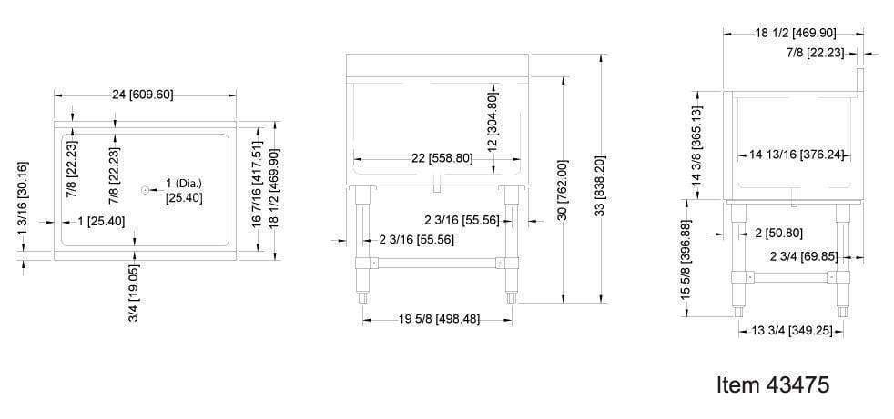 It is 18.5" deep, and can be purchased either 24" wide or 36" wide. It has a 1" drain size and it comes with a plastic bottle holder.