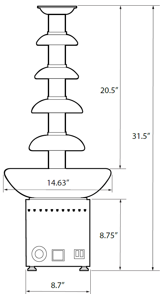Omcan's 40381 is a chocolate fountain with 5 tiers, an extravagant dessert display for large-scale events and parties. It is easy to operate and clean, can quickly melt chocolate using the adjustable temperature, and is built to last with a sturdy yet polished stainless steel construction.