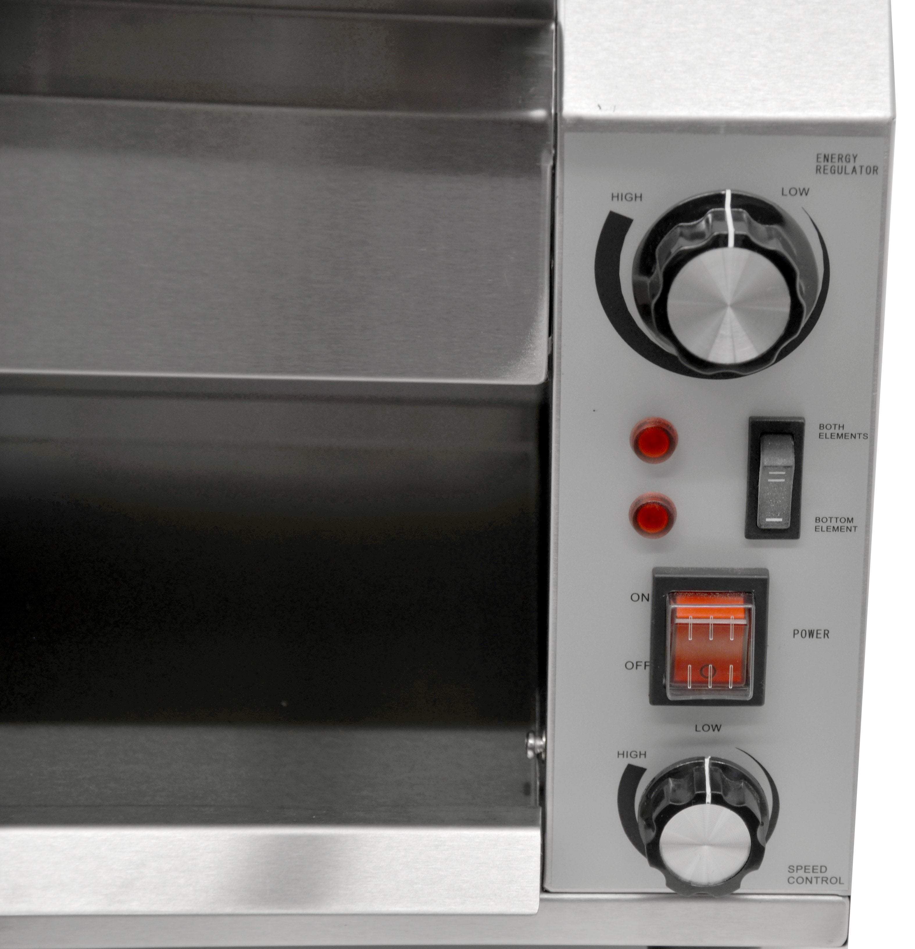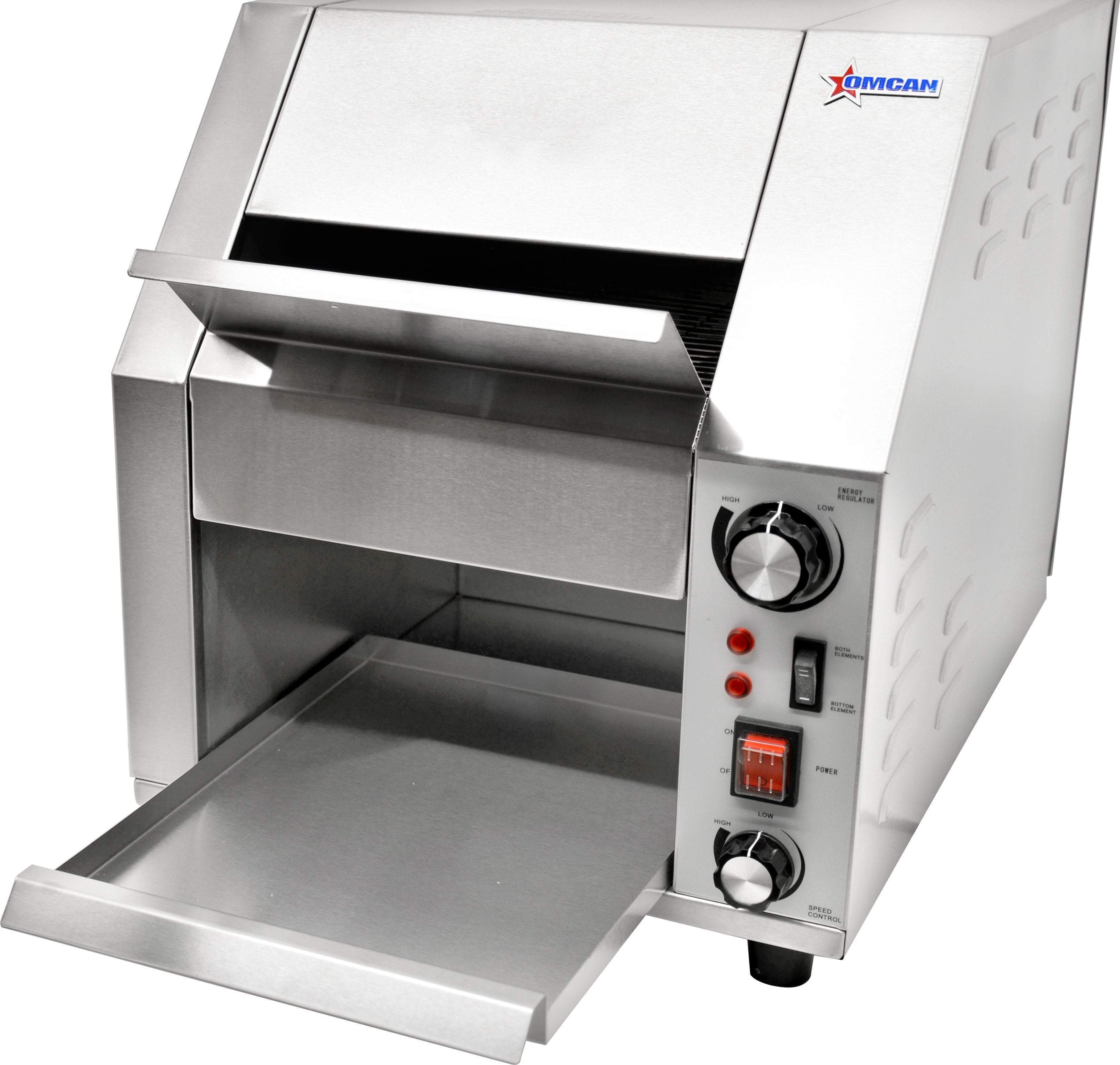 The Omcan CE-CN-0254-T is equipped with a variable speed control, adjustable heat control, and switches for the bottom and top/bottom heating elements. Its body is made of stainless steel, and it comes with a removable crumb tray and bread catcher. Depending on the type of bread used, this machine can produce up to 300 slices per hour.
