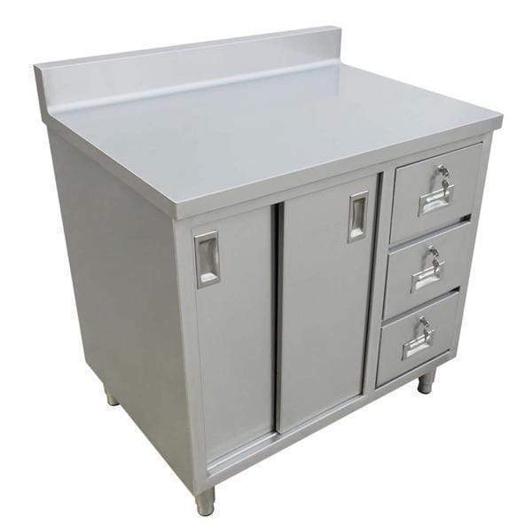 This Omcan stainless steel work table with a cabinet, drawers. and backsplash is 24" from front to back and comes in three different widths: 48", 60", and 72".