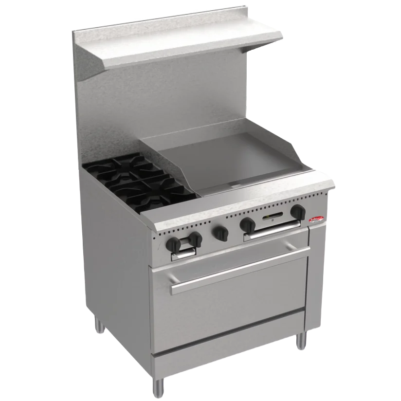 The BakeMax America BAS36-12 – 2 Burner Gas Range with 24” Manual Griddle is designed to provide the ultimate in performance and durability. Allowing you to roast and cook a wide range of meals, with efficiency, convenience at an affordable price.