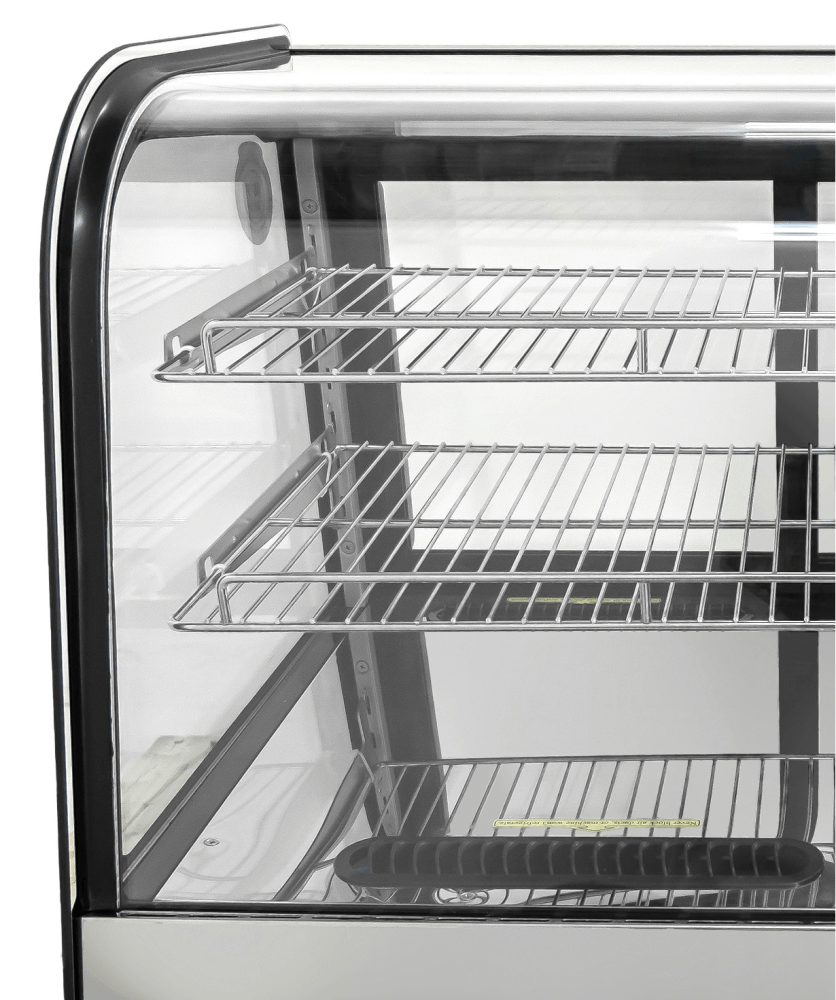 The showcase has a tempered glass display, curved at the front and sliding doors at the back. There is a digital thermostat for controlling temperature, an automatic defrost feature, and EPS insulation (expanded polystyrene). The shelves have chrome plating plus a load capacity of 44 pounds.