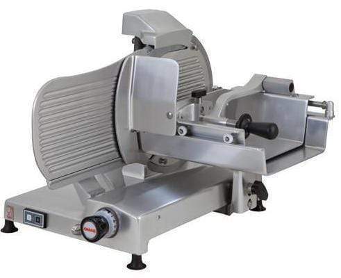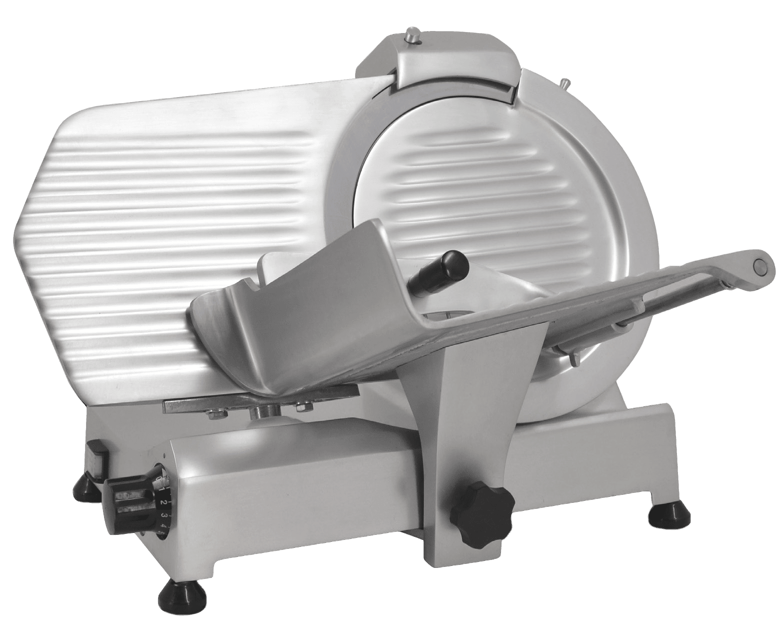 Omcan has a number of manual meat slicers with a 12" blade: they have light, medium, and heavy duty models available. Some are gear driven, some are belt driven. Some are part of their Economy meat slicers (which were made in China); others are their "Elite" series (which were made in Italy).