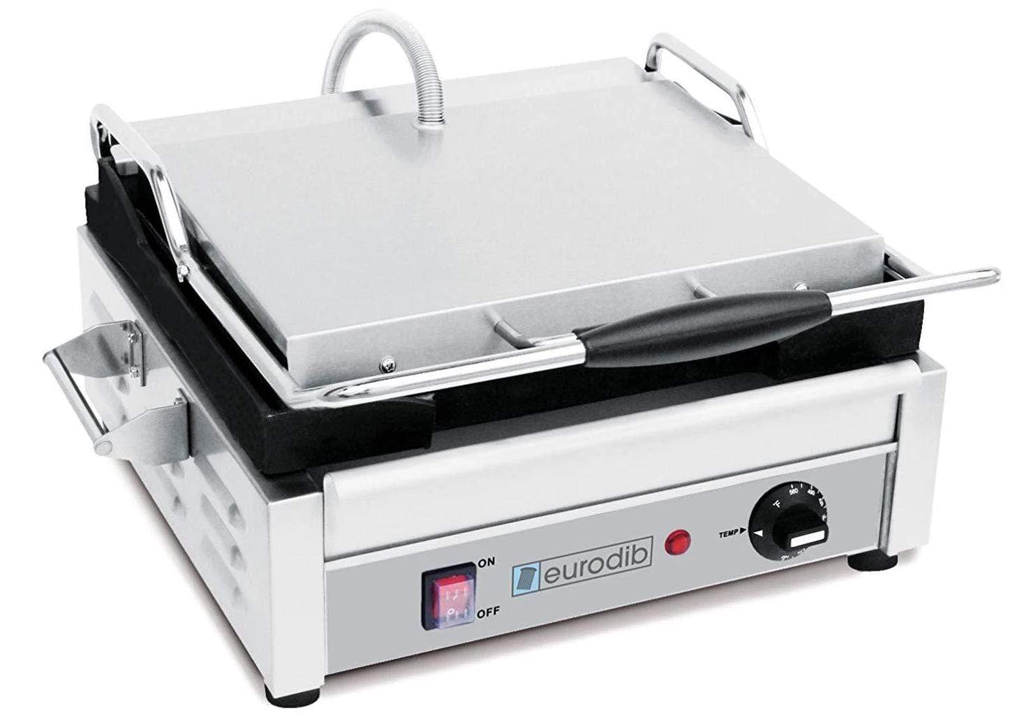 The Eurodib SFE02340 is their medium-duty panini grill with a 14" x 10" smooth cooking surface. It comes standard as a 120V, 1800W, 15A machine, but can also be ordered as a 240V, 2400W, 10A machine.