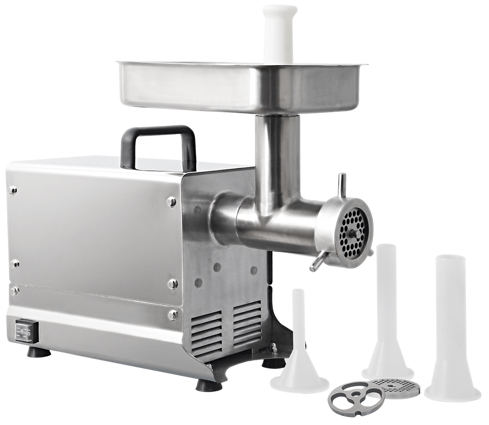 The MG-CN-0032-E has 1.5 HP, 1.1kW of power, and can grind up to 750 pounds of meat per hour, making this model perfect for any butcher shop or restaurant with high volume output. It features stainless steel components and a permanently lubricated motor for quieter operation. It has a micro safety switch for the tray and comes with 2 stainless steel cutting plates and 3 stuffing tubes for making sausages.